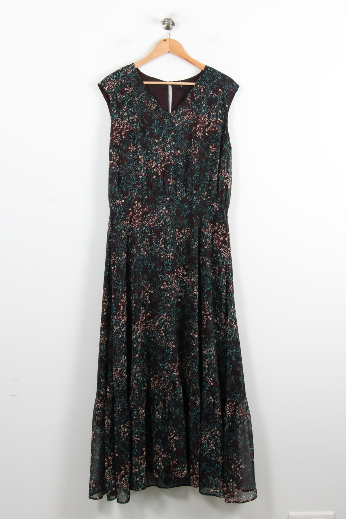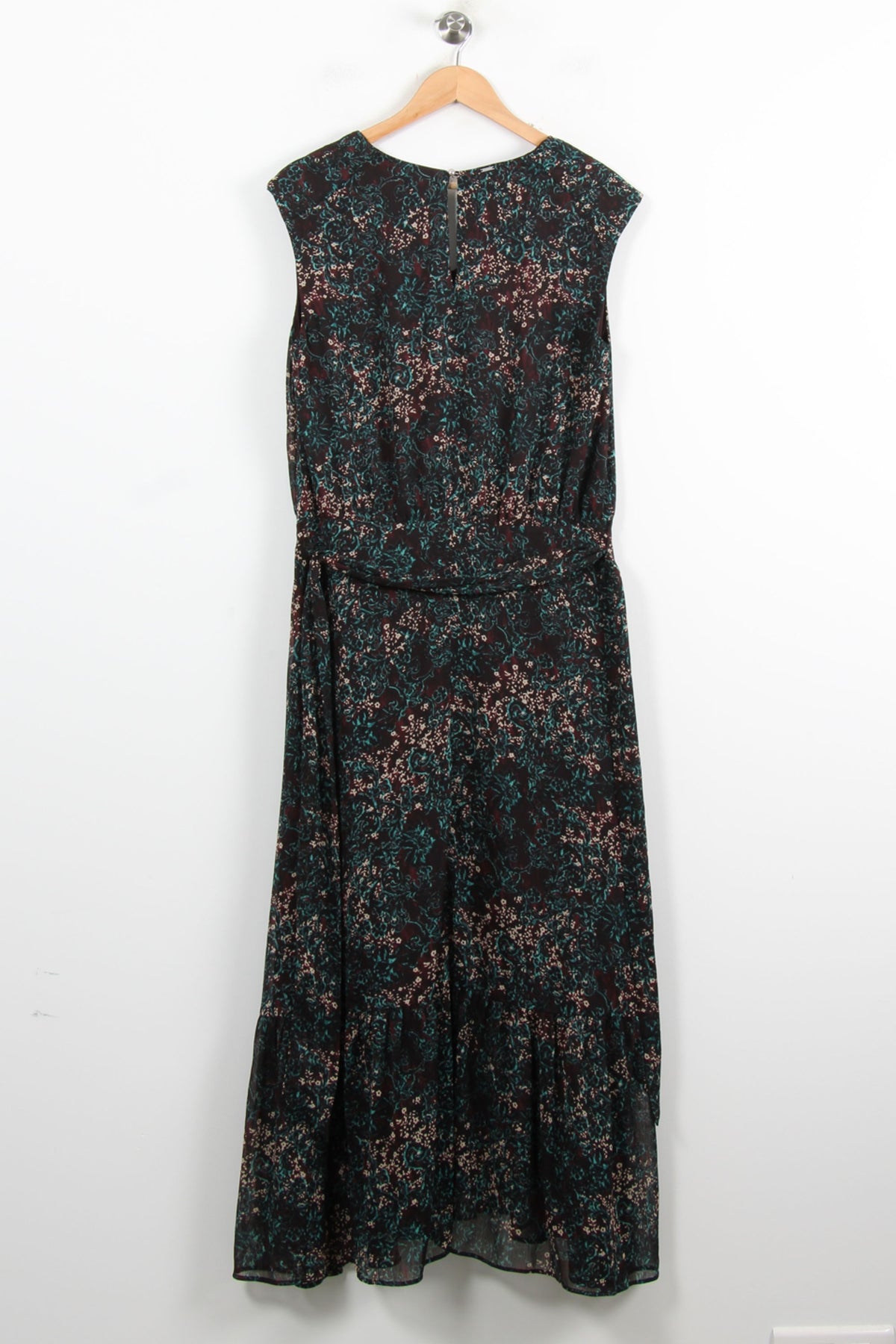 Robe longue multicolore IKKS, taille XL/42, à imprimé floral élégant. Confectionnée dans une matière fluide au joli tombé, cette robe présente un col en V et des détails de plis qui lui confèrent raffinement et féminité. Idéale pour un dîner ou une occasion spéciale, apportant une touche sophistiquée à votre silhouette.
