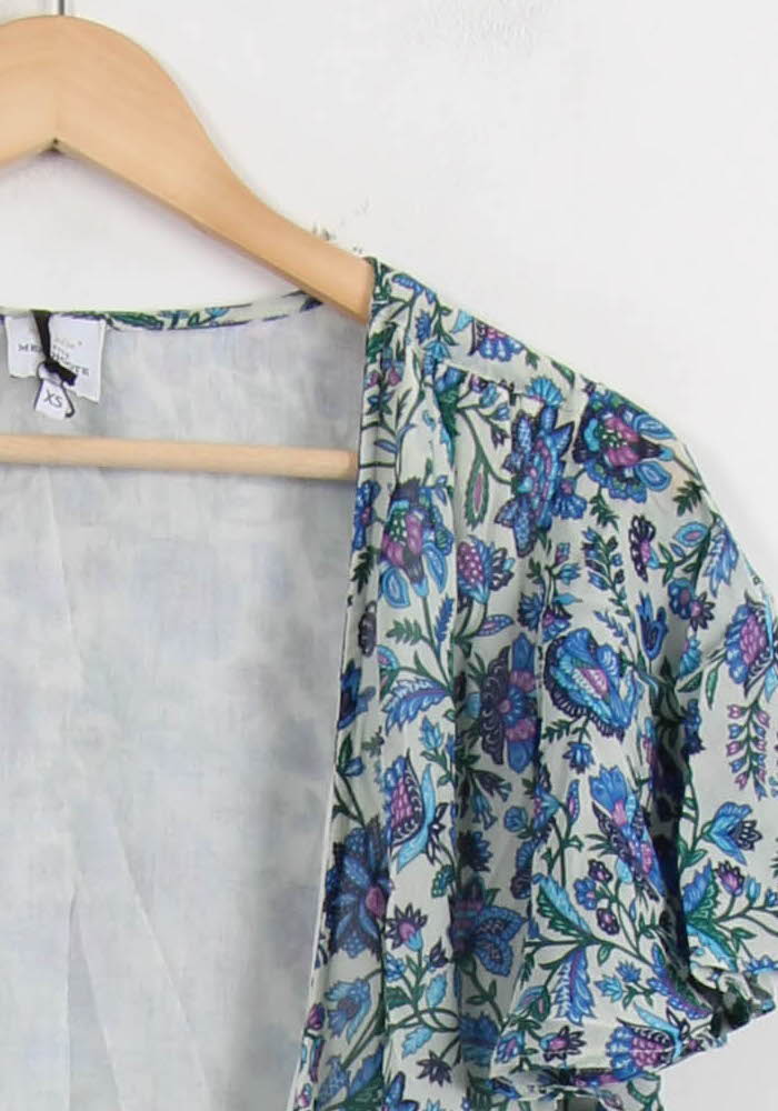 Robe longue multicolore Petite Mendigote, taille XS/34, en voile léger à imprimé floral bleuté, dotée de manches courtes à volants. La matière fluide et délicate, associée à une taille ceinturée et des finitions volantées, confère à cette pièce une touche sophistiquée et féminine unique. Parfaite pour une garden-party estivale ou une sortie en journée, cette robe apporte une élégance naturelle et un style bohème raffiné.