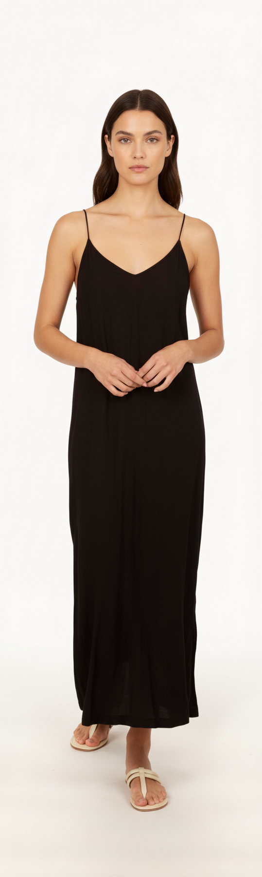 Robe noire à fines bretelles Karma Koma, taille L/40. Confectionnée dans une matière fluide, cette robe présente un élégant décolleté en V et des lignes épurées qui lui confèrent une allure raffinée et intemporelle. Idéale pour une soirée estivale ou un événement chic, elle se porte facilement avec des accessoires discrets.