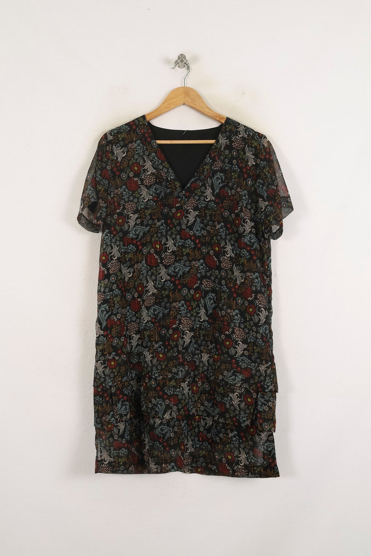Robe IKKS multicolore à motif floral, taille XL/42, parfaite pour un look féminin et raffiné. Confectionnée dans un tissu léger au tombé fluide, cette robe se distingue par son jeu de transparence sur les manches courtes et son imprimé floral délicat, qui lui confèrent originalité et élégance. Idéale pour une sortie estivale en ville ou un déjeuner entre amis.