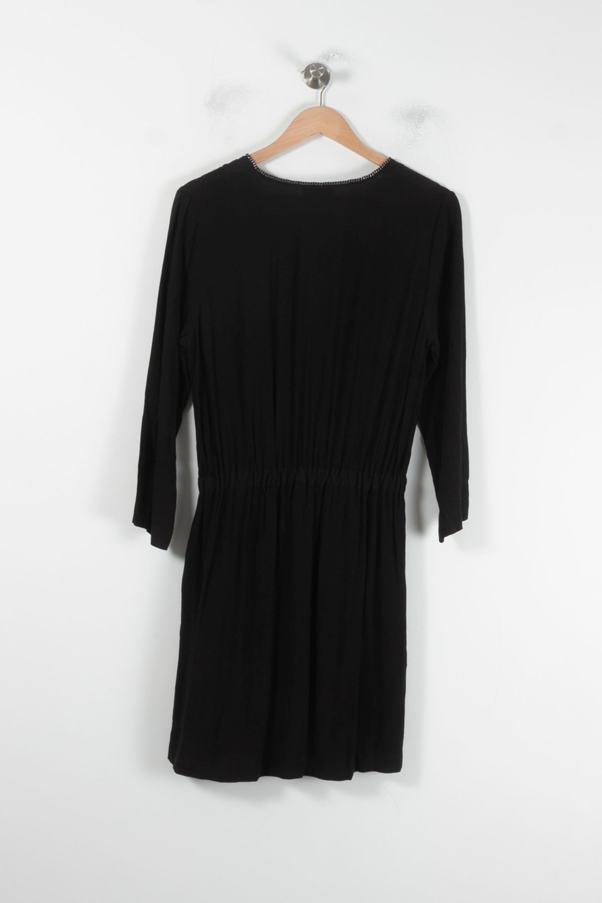 Robe noire Suncoo taille S/36 à manches 3/4, encolure en V, finitions perlées sur le col et les poches. Confectionnée en 100% viscose doublée, cette robe offre un tombé fluide et léger, souligné par des détails perlés raffinés qui en font une pièce élégante et unique. Idéale pour un dîner entre amis ou une soirée habillée, elle se porte aussi bien au quotidien qu’en occasion spéciale.