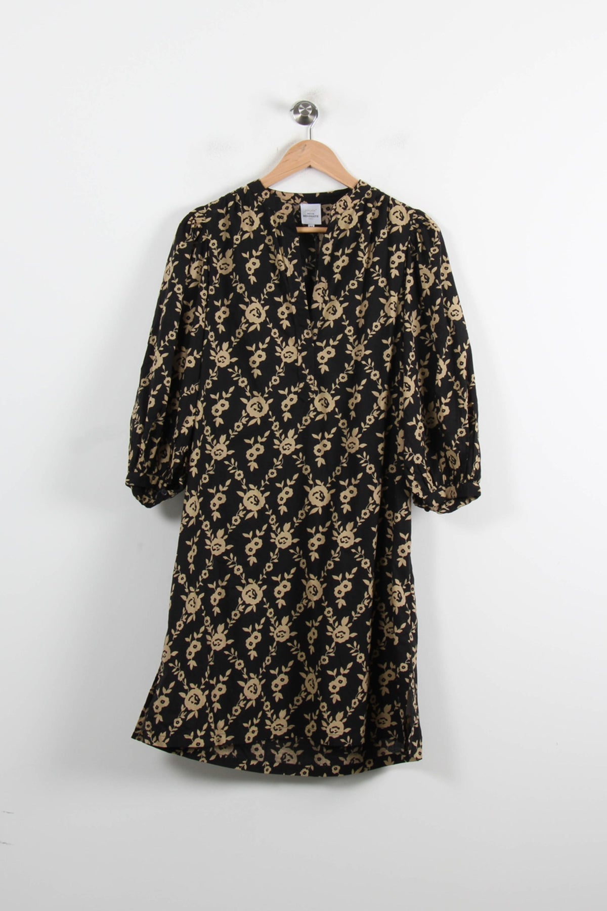 Robe noire Petite Mendigote en taille M/38, à imprimé floral beige, idéale pour une allure féminine et moderne. Confectionnée dans une matière fluide et légère, cette pièce est sublimée par des manches trois-quarts bouffantes, un col fendu et un motif fleuri délicat qui lui confèrent son originalité et son charme unique. Parfaite pour une sortie entre amies, un déjeuner en ville ou un événement semi-formel.