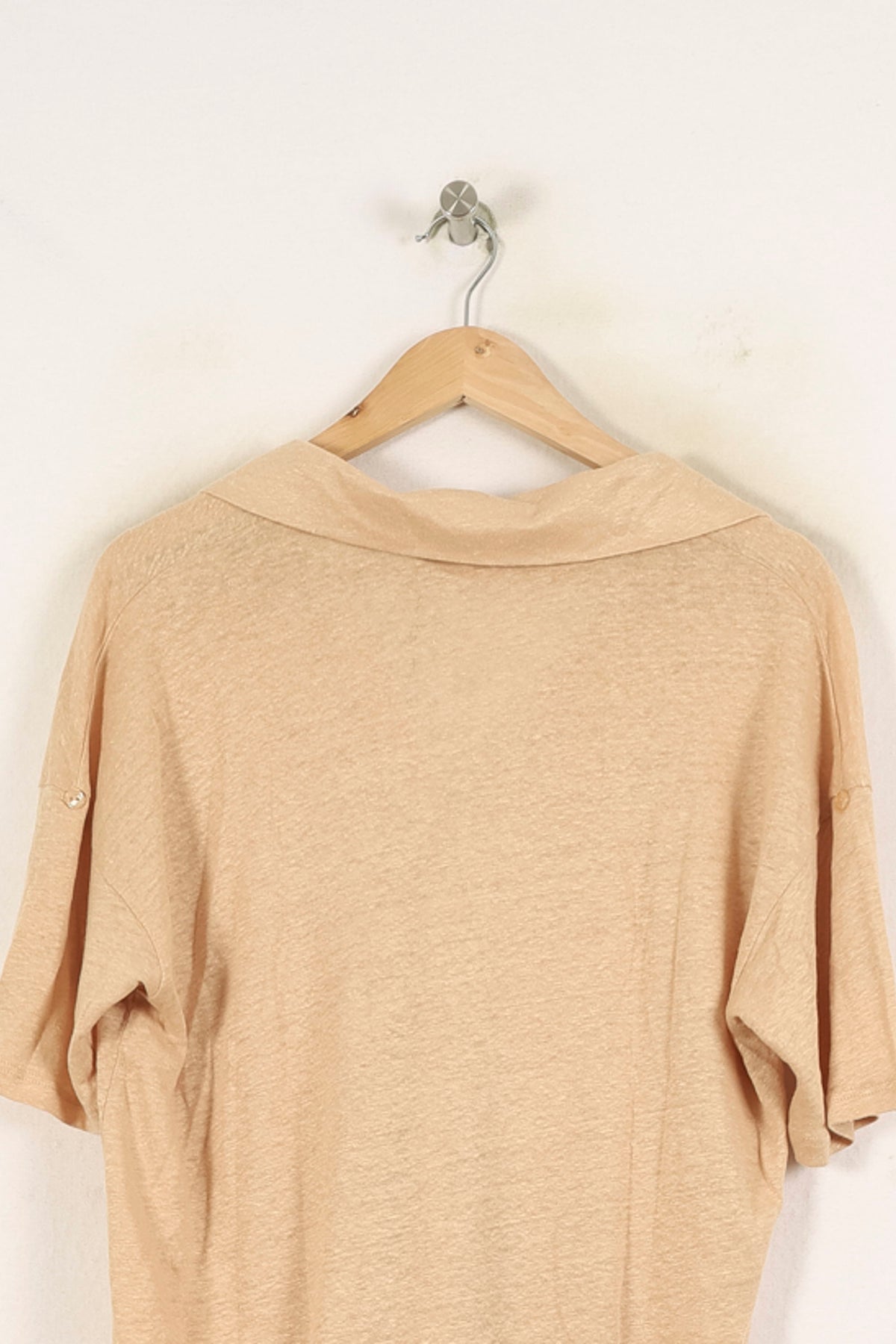 Robe beige Notshy Cashmere T40/L à manches courtes, coupe droite, col ouvert. Confectionnée dans une matière douce, cette robe se distingue par sa simplicité élégante, ses fentes discrètes sur le bas et son col original qui apportent une touche contemporaine. Idéale pour une journée estivale décontractée ou un brunch entre amis.