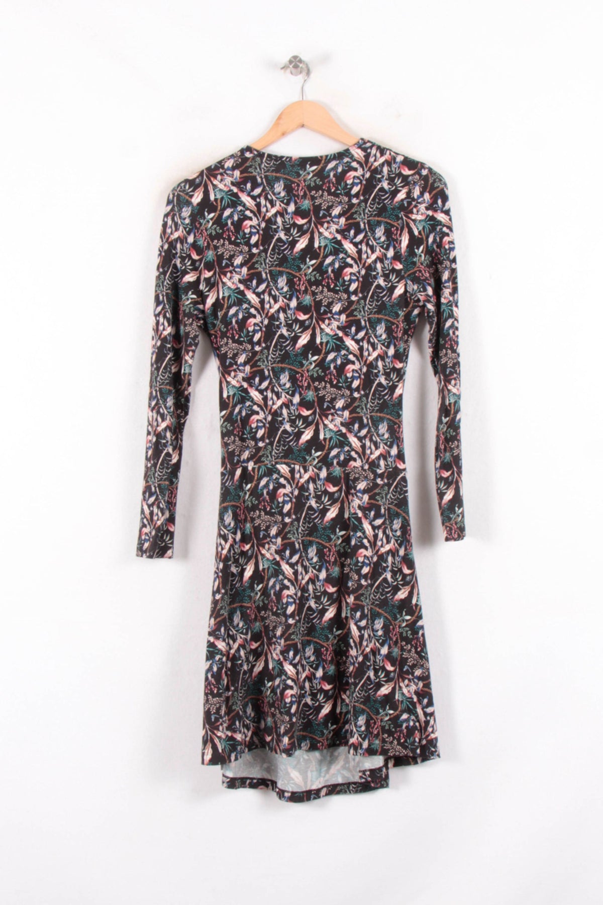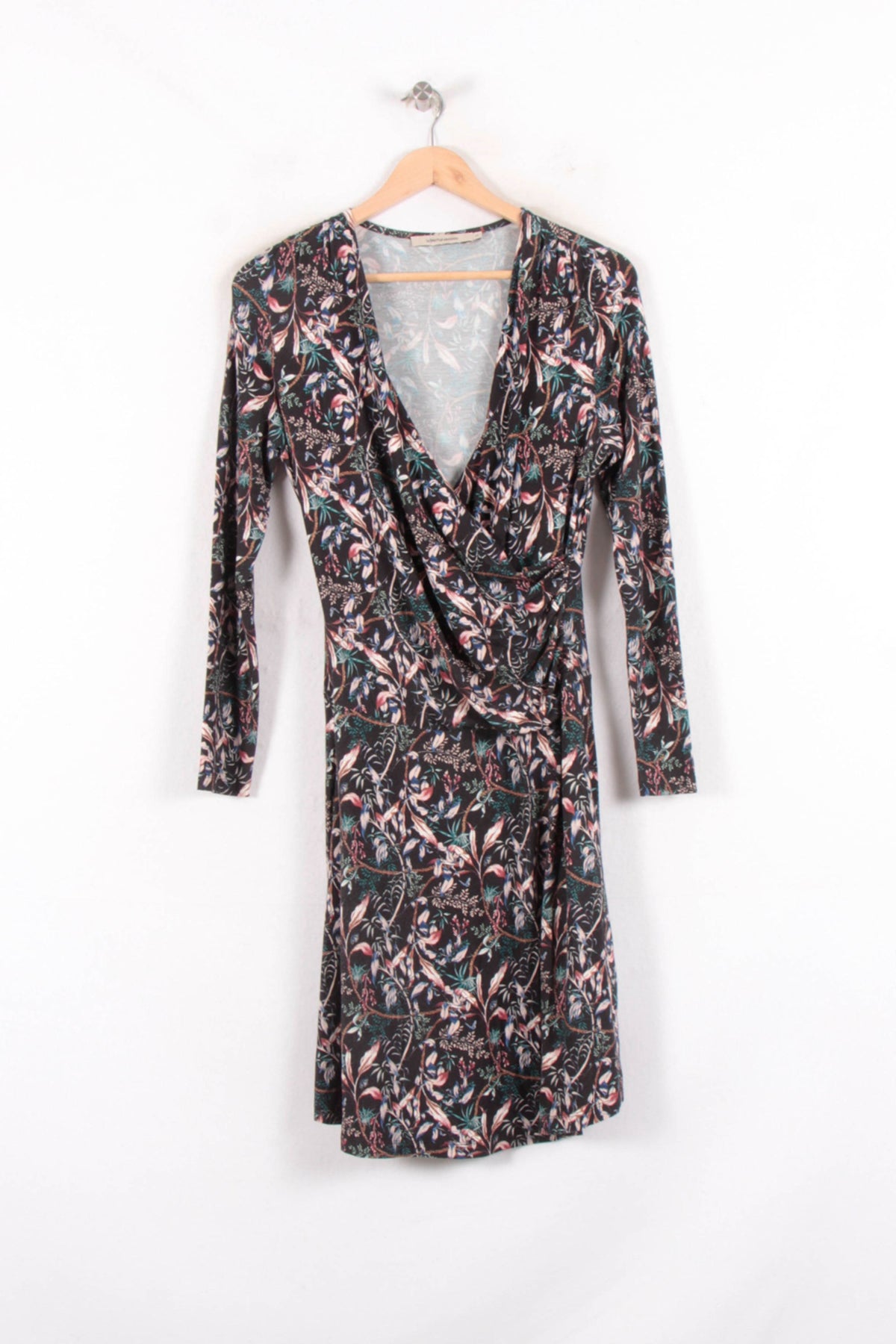Robe portefeuille à motif fleuri multicolore La Fée Maraboutée, taille S/36. Confectionnée dans une matière fluide, cette robe se distingue par son col cache-cœur, ses manches longues et son imprimé végétal raffiné. Idéale pour une soirée entre amis ou un déjeuner en ville, elle apportera une touche élégante et originale à votre tenue.