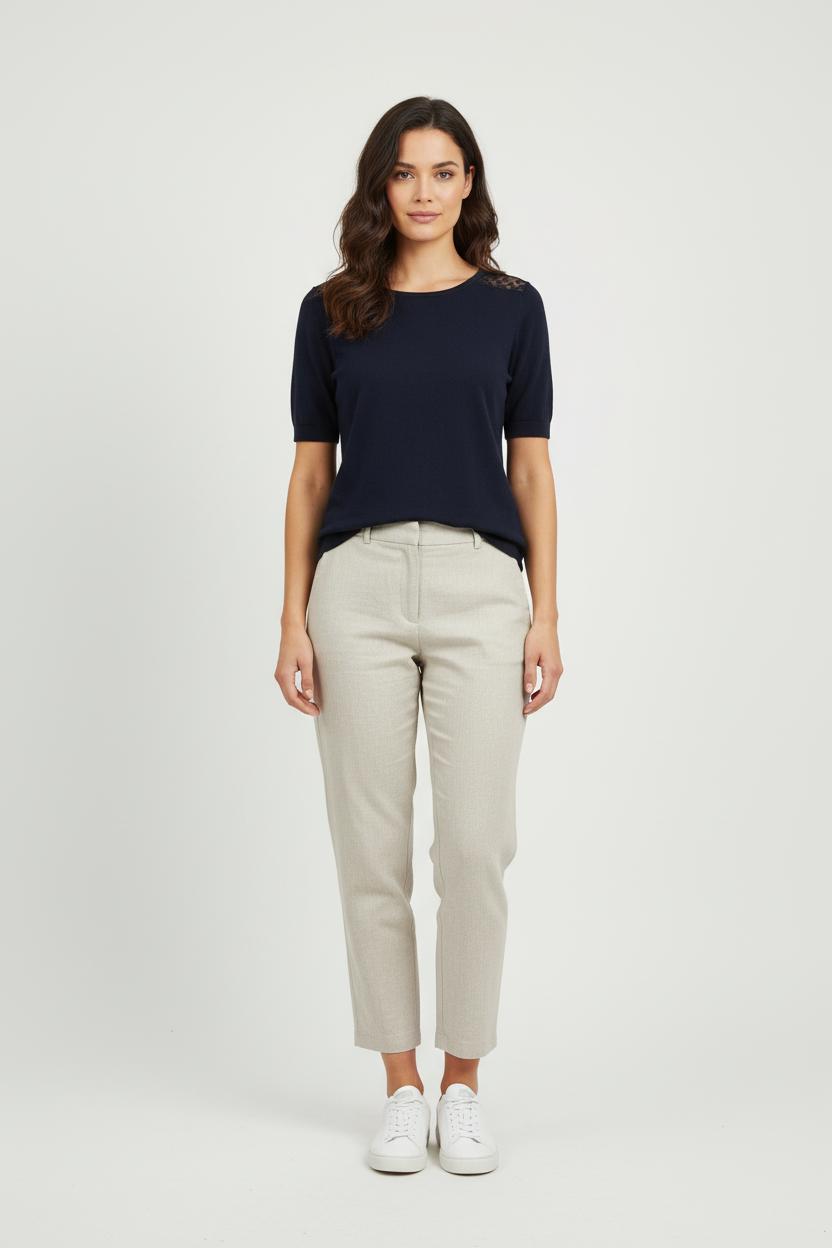 T-shirt bleu Des Petits Hauts, taille L/40, élégance décontractée signée par la marque. Ce modèle en maille fine se distingue par des empiècements délicats en tulle à pois sur les épaules, apportant une touche de raffinement discret à une coupe classique. Idéal pour un déjeuner entre amis ou une journée au bureau, il accompagne aussi parfaitement un jean pour un look casual sophistiqué.