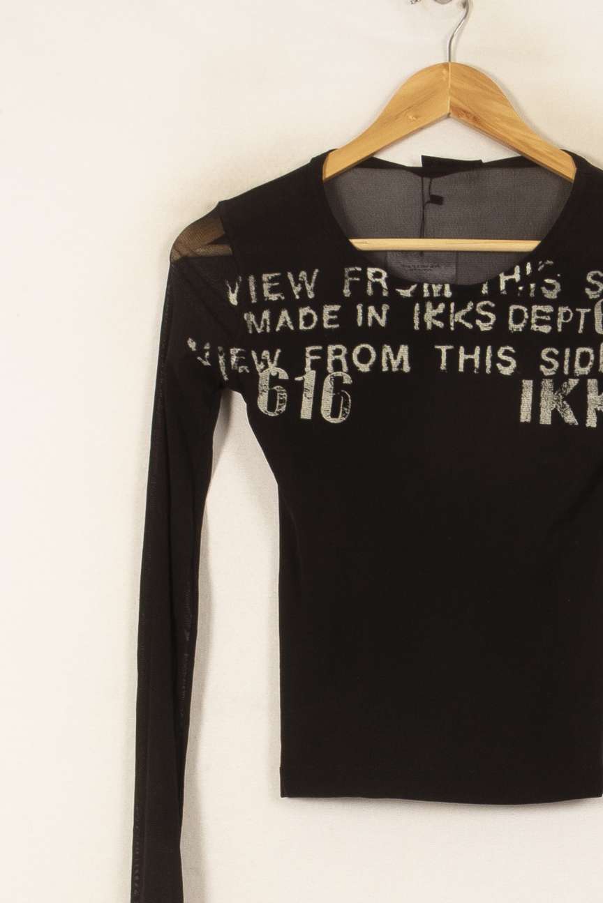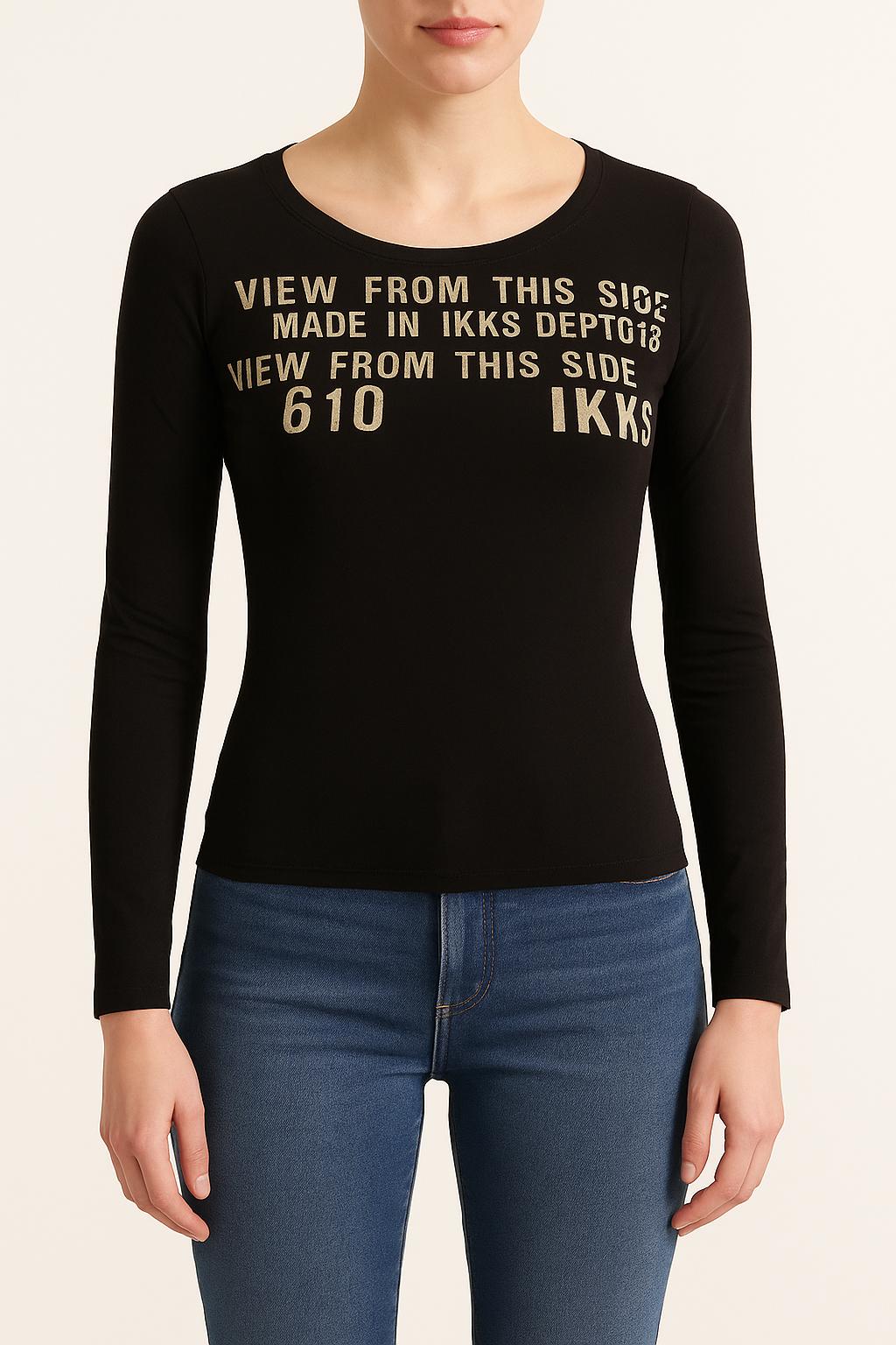 Top noir à manches longues IKKS – Taille Unique, marque IKKS. Réalisé dans une matière fluide et légère, ce top se distingue par ses inscriptions argentées "VIEW FROM THIS SIDE" et "MADE IN IKKS DEPT" placées sur le haut du buste, ajoutant une touche graphique et moderne à la silhouette. Ce modèle s’adapte idéalement à une sortie entre amis ou à une soirée décontractée, pour un look tendance et affirmé.