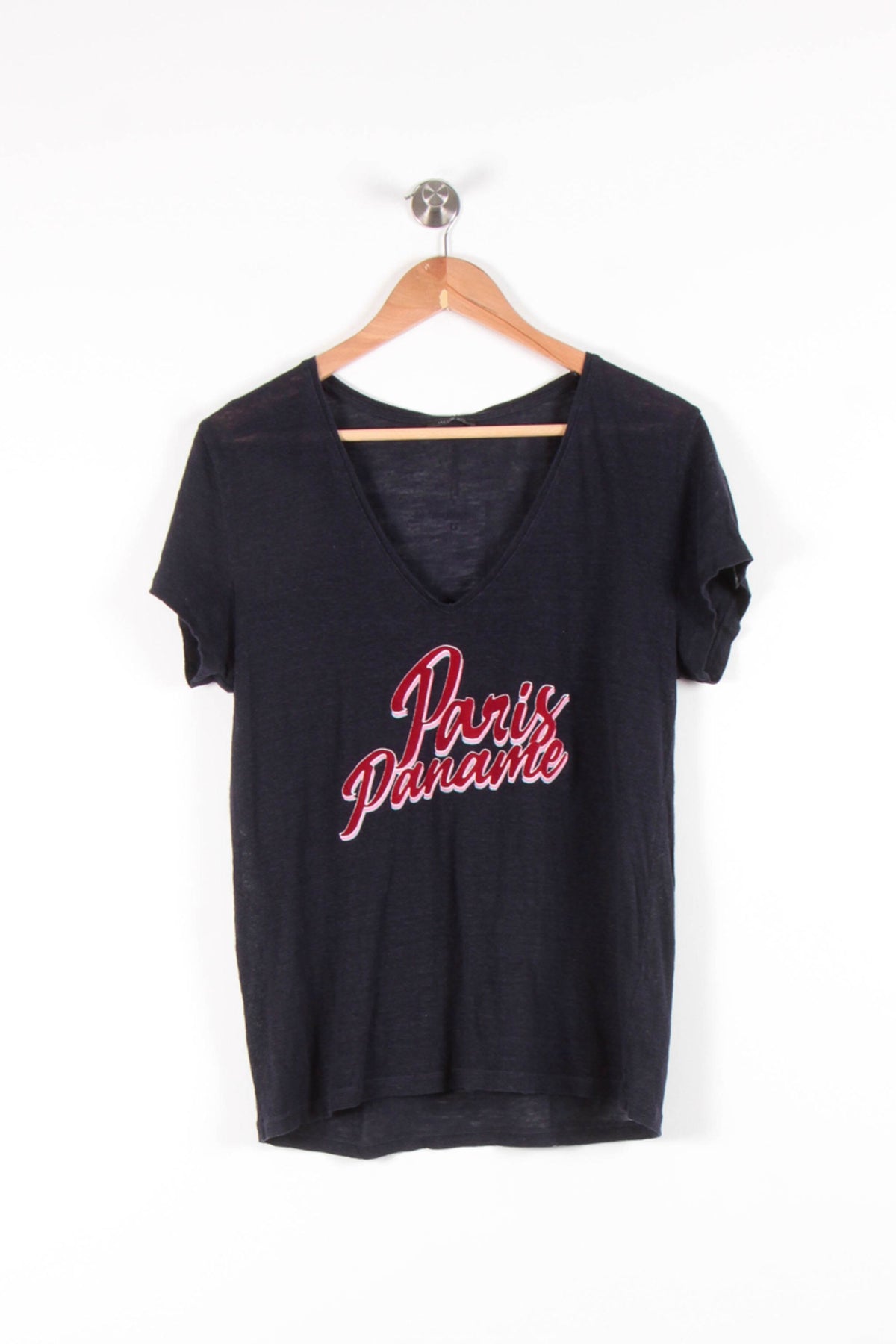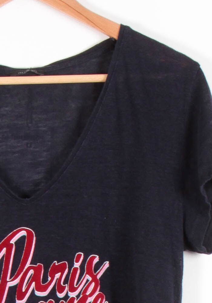 Top IKKS bleu "Paris Paname" en taille M/38, arborant un col en V et des manches courtes pour une allure moderne et décontractée. Confectionné dans une matière légère et fluide, ce t-shirt se distingue par son imprimé "Paris Paname" en lettres rouges et blanches apportant une touche urbaine et graphique à la pièce. Idéal pour apporter une note tendance à une tenue casual lors d'une sortie entre amis ou d'une promenade en ville.