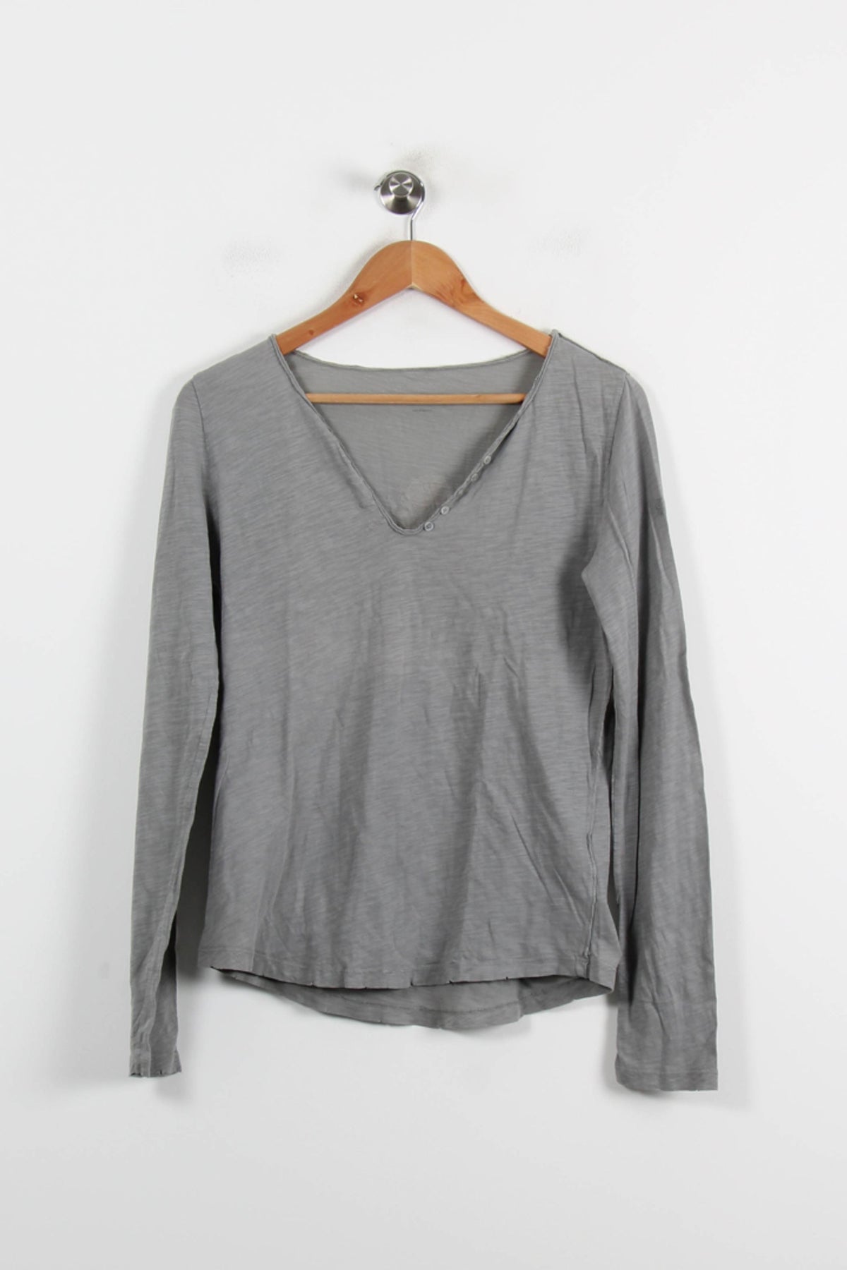 Top gris à manches longues Zadig&Voltaire, taille S/36, offrant une coupe classique et élégante. Réalisé dans une matière fluide et légère, il se distingue par un col en V subtil orné de petits boutons, apportant une touche d’originalité discrète à la pièce. Idéal pour une journée de travail ou un rendez-vous décontracté, ce top saura s’adapter à toutes vos envies.