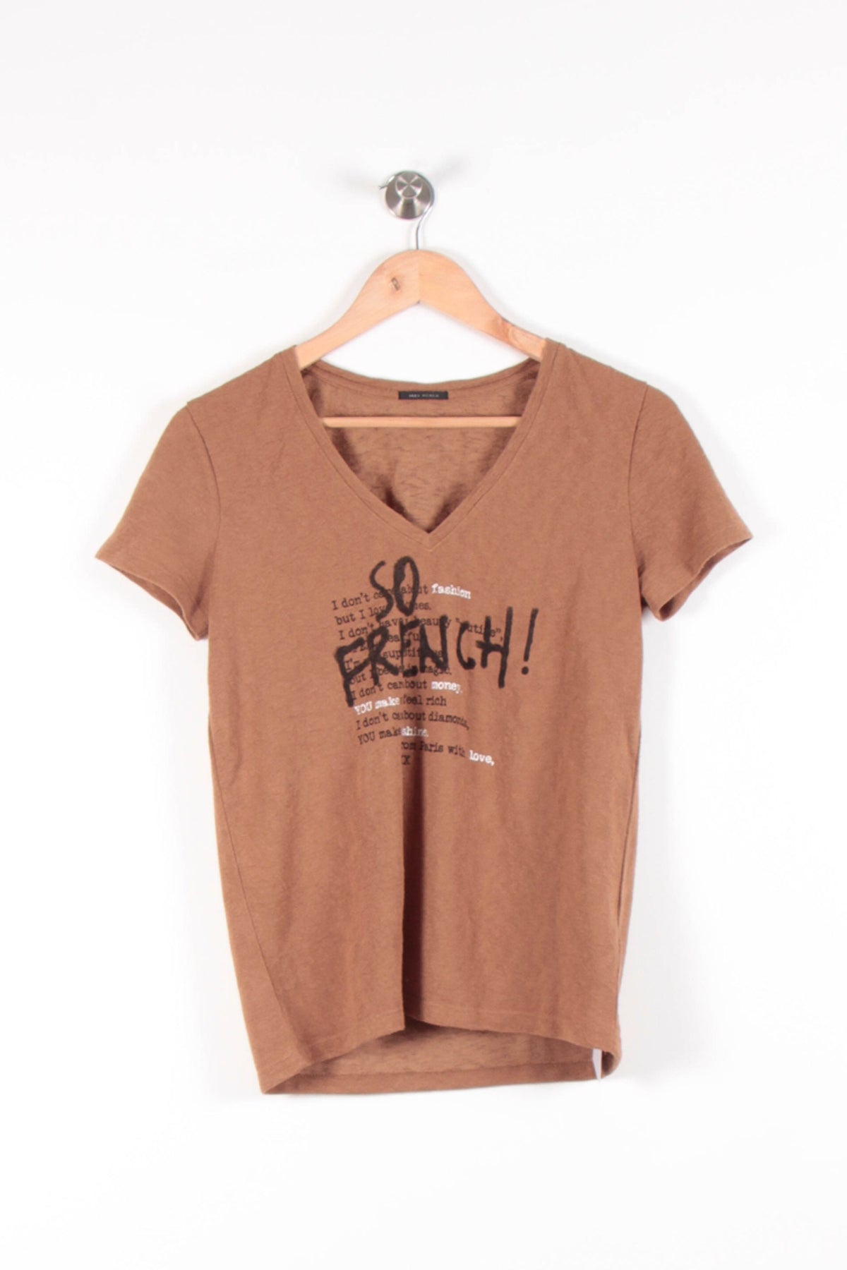 T-shirt marron à message "SO FRENCH!", taille S/36, marque IKKS. Ce top en matière légère présente un col V élégant et des inscriptions imprimées à l’avant, qui apportent une touche de caractère et d’originalité à la pièce. Parfait pour une sortie détendue entre amis ou une balade citadine, il se porte facilement au quotidien.