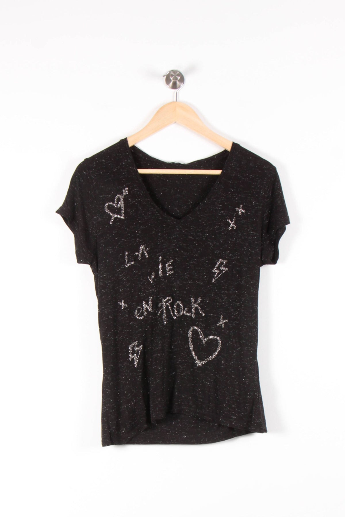T-shirt noir à motif pailleté "La vie en rock" IKKS, taille S/36. Confectionné dans une matière légère à l’aspect chiné, ce top séduit par ses inscriptions et motifs argentés évoquant l’esprit rock, offrant une touche originale et moderne à une silhouette épurée. Parfait pour un look décontracté lors d’une sortie entre amis ou un concert.