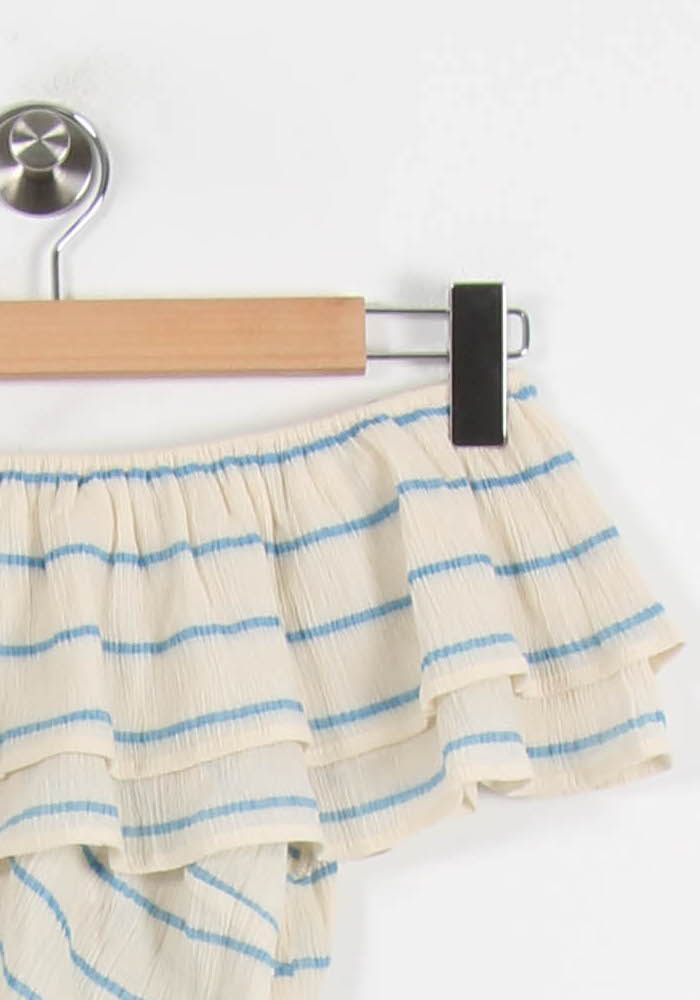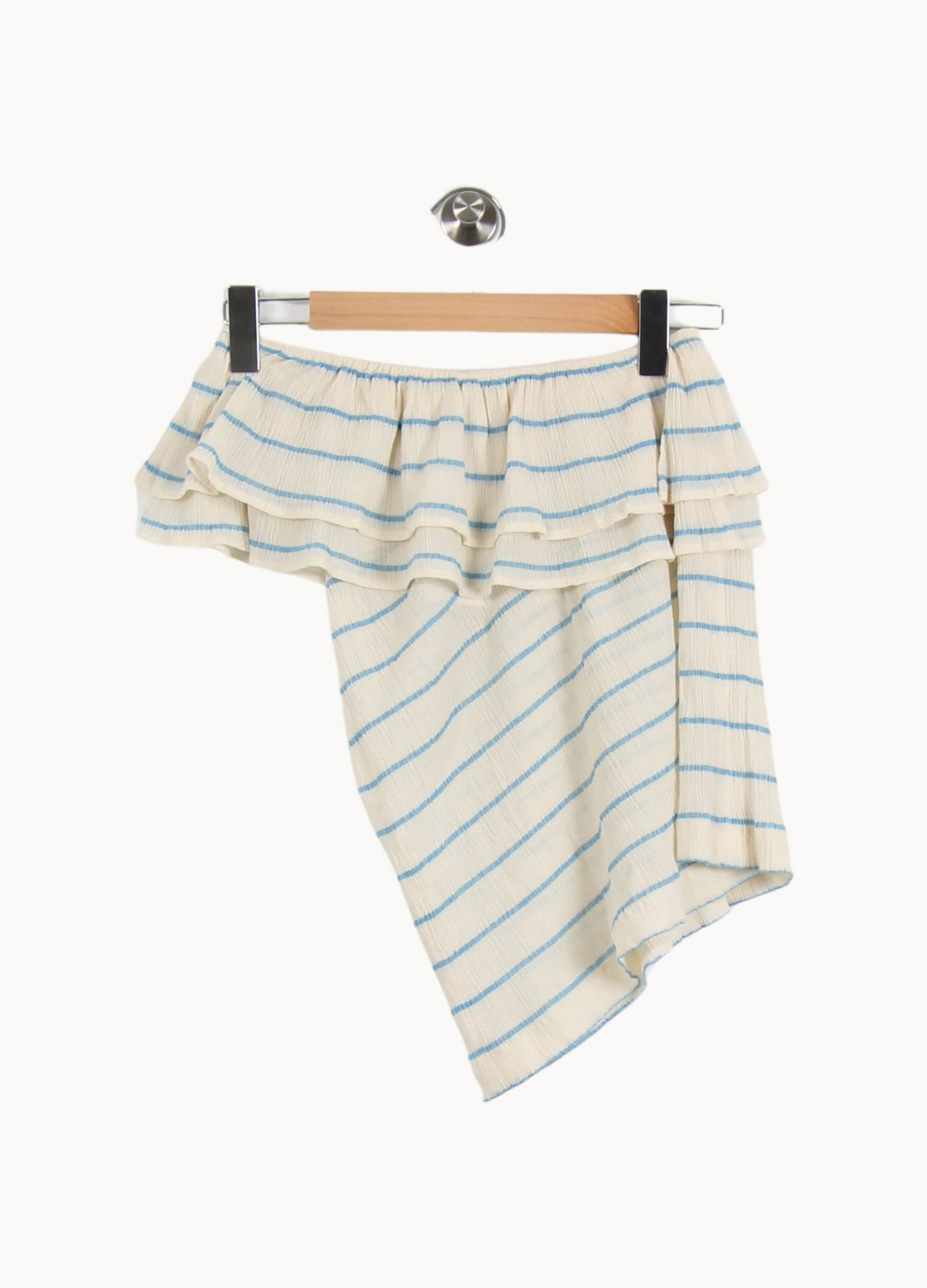 Top asymétrique à volants Sézane, taille M/38, en coloris beige à fines rayures bleues. Confectionné dans une matière légère à effet plissé, ce top se distingue par son encolure volantée et son design asymétrique, apportant une touche résolument moderne et raffinée. Idéal pour une journée estivale ou un déjeuner en terrasse.