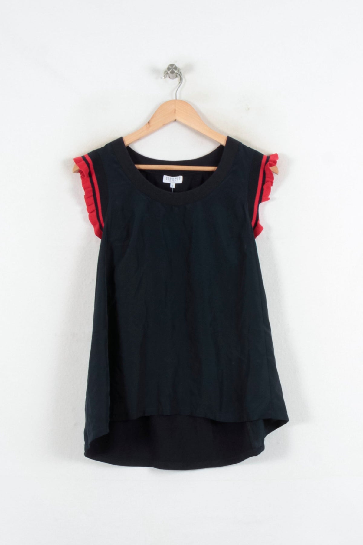 Top bleu Claudie Pierlot taille M/38, sans manches, orné de volants rouges sur les épaules qui apportent une touche d’originalité. La matière semble fluide et légère, soulignée par des détails plissés contrastés au niveau des manches, qui rendent ce haut unique et élégant. Idéal pour un déjeuner en terrasse ou une sortie entre amis, associé à une jupe ou un pantalon ajusté.