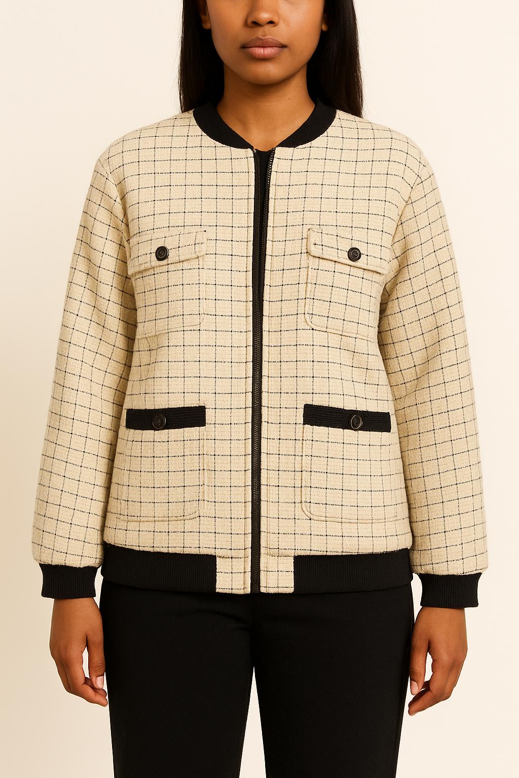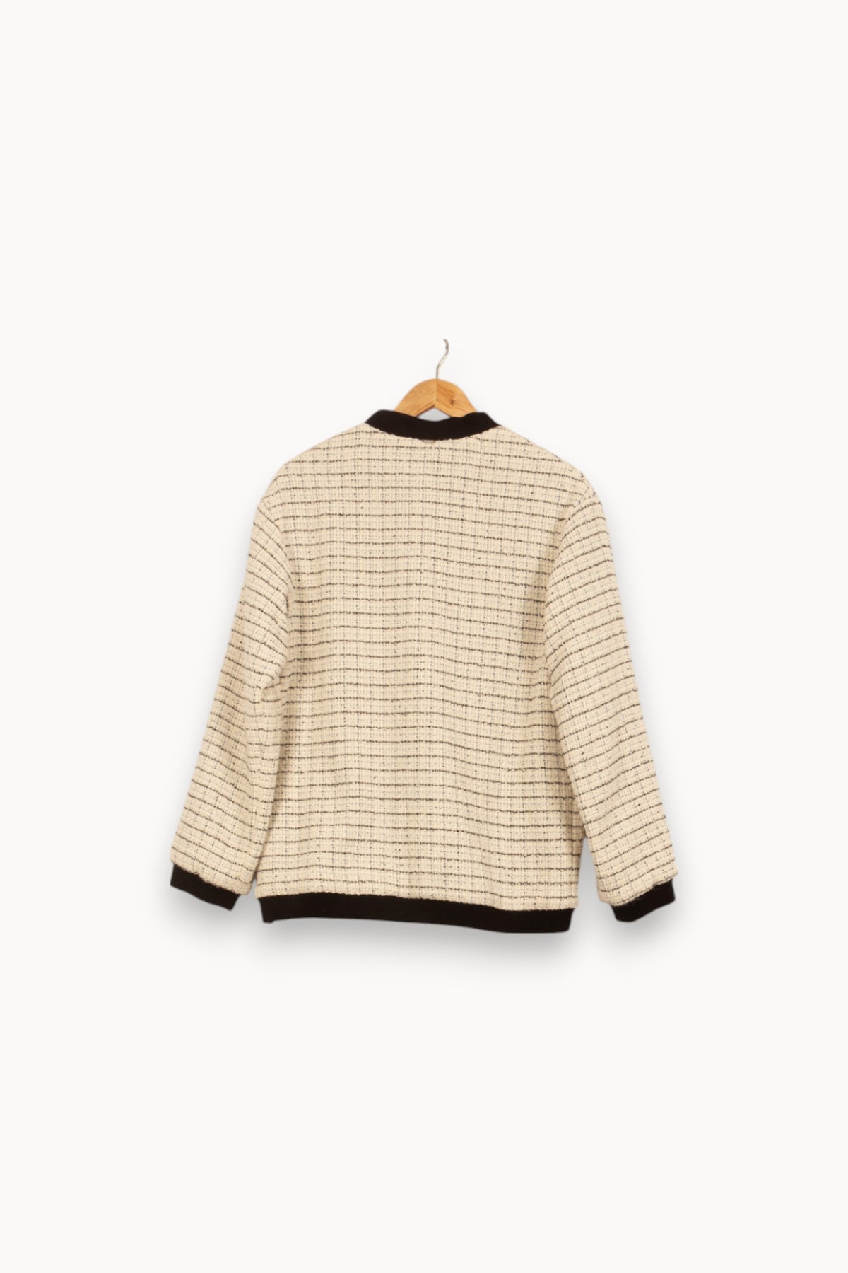 Veste IKKS en tweed blanc pour femme, taille L/40, à la coupe droite et finition contrastée noire. Cette pièce se distingue par son tissu texturé façon tweed à carreaux fins, souligné de détails noirs sur le col, les poignets, la fermeture centrale ainsi que les poches à boutons, apportant élégance et modernité à l’ensemble. Parfaite pour sublimer une tenue de bureau ou pour une sortie chic en soirée.