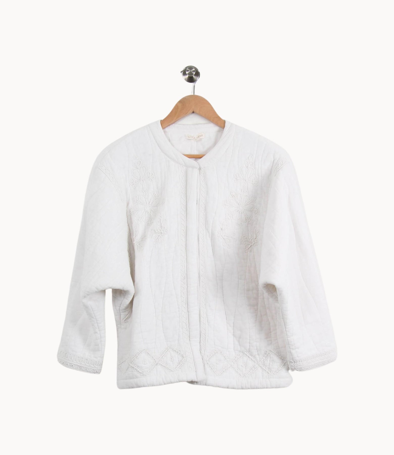Veste blanche Louise Misha en taille S/36, un modèle raffiné aux détails brodés. Confectionnée dans une matière matelassée, cette veste présente un élégant motif de broderies ton sur ton et des finitions travaillées qui lui confèrent une touche délicate et sophistiquée. Idéale pour une sortie décontractée entre amis ou pour apporter une note chic à une tenue de journée.