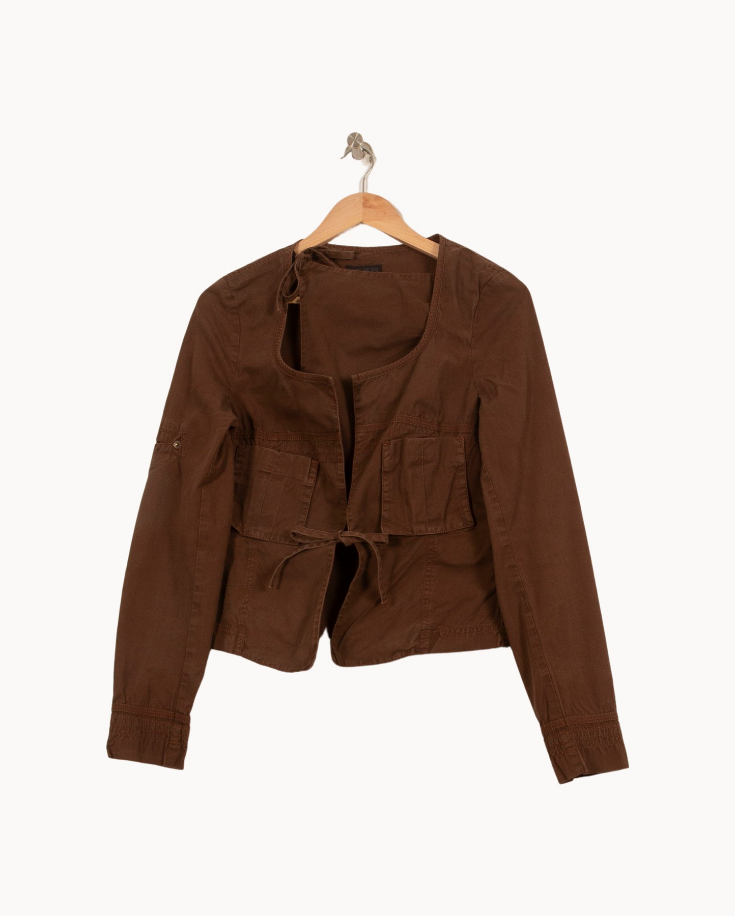 Veste IKKS femme, taille M/38, coloris marron, idéale pour une allure casual chic. Confectionnée dans une matière légère et agréable, elle se distingue par sa coupe ajustée, ses poches plaquées à l'avant ainsi que sa fermeture par liens à nouer qui lui confèrent une touche originale et moderne. Parfaite pour accompagner une tenue décontractée lors d'une sortie en ville ou pour un rendez-vous informel.