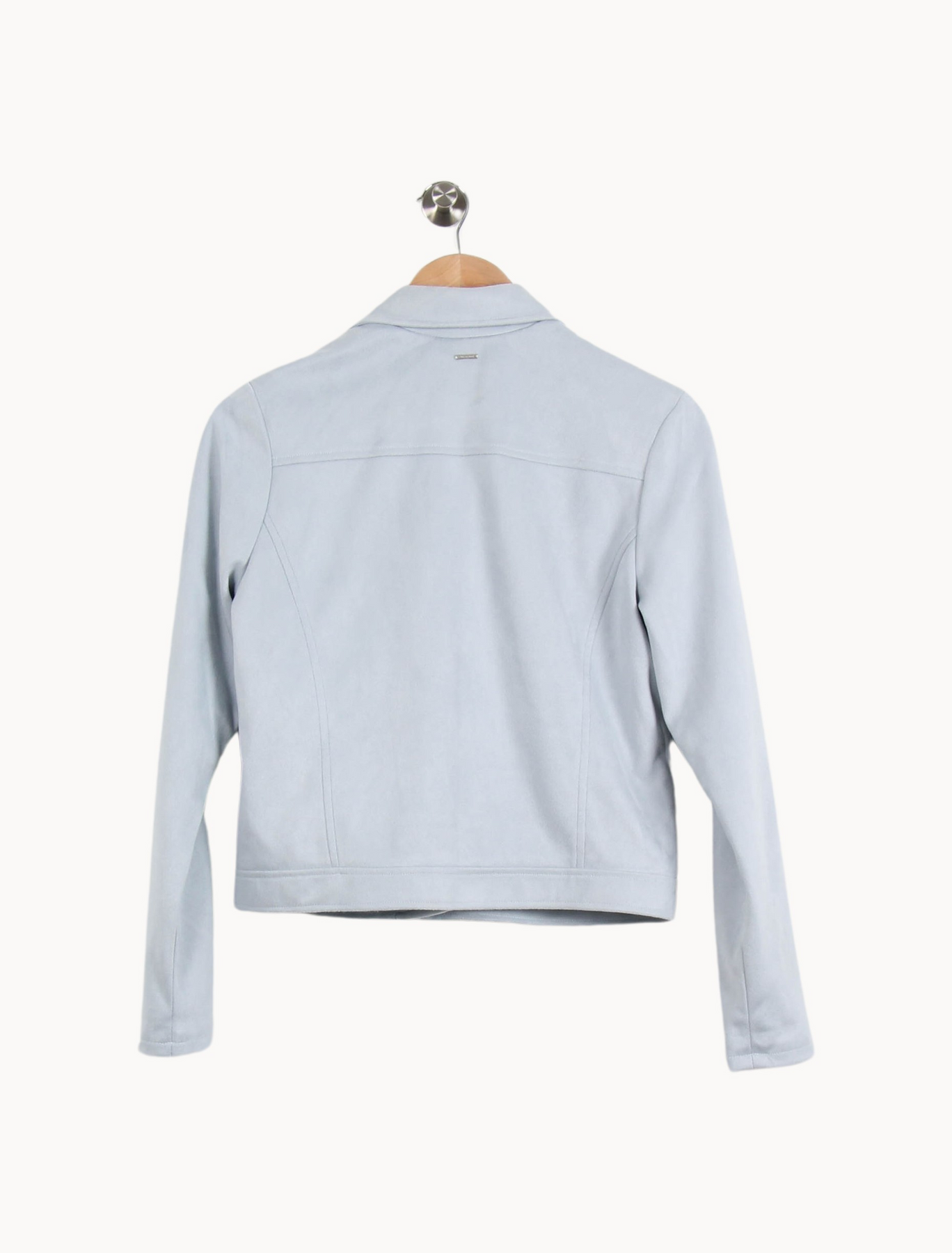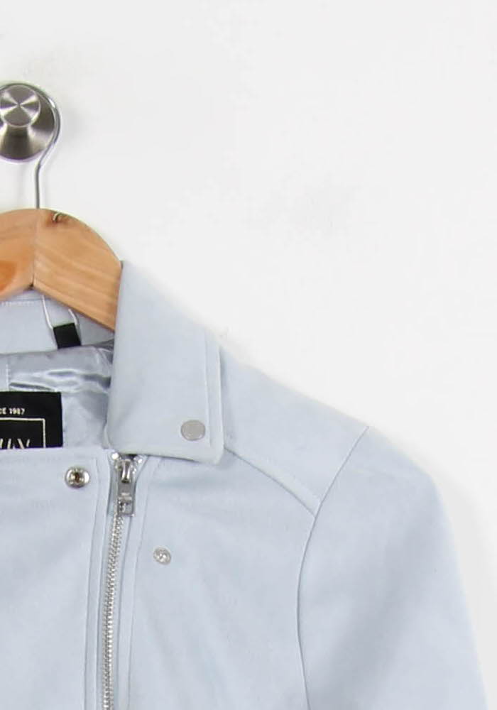 Veste bleu clair IKKS femme, taille M/38, élégante et moderne présentant une coupe droite avec fermeture zippée asymétrique. Sa matière douce au toucher et ses finitions soignées, comme les détails métalliques argentés et les poches discrètes, apportent une touche raffinée et contemporaine à ce modèle. Idéale pour sublimer une tenue de ville ou accessoiriser un look casual lors d’une sortie entre amis.